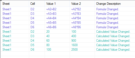 The table at the bottom will quickly give you a detailed overview of the changes. Note that you can uncheck any of the items at the left in case there are hundreds of entries. You can filter to only see changes in entered values, calculated values, formulas, etc.