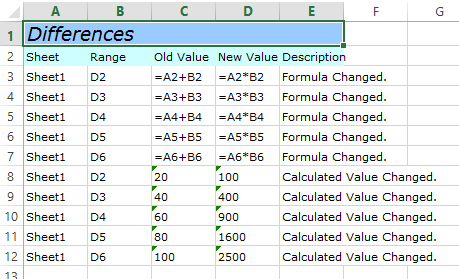 Now you can quickly see by the color-coded cells what values or formulas are different.
