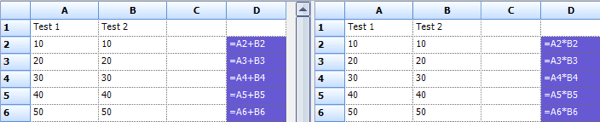 Since the only difference is one column is using a sum and one is using multiplication, the values are highlighted in purple, which means the difference is in the formulas. You can also click the Show Formulas button in the ribbon to quickly see the difference in the formulas.
