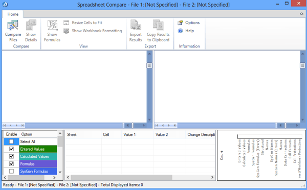 There is only one ribbon tab that has a couple of options like showing formulas, resizing cells to fit and exporting results. In the center is the split screen view of the two Excel files you will be comparing.