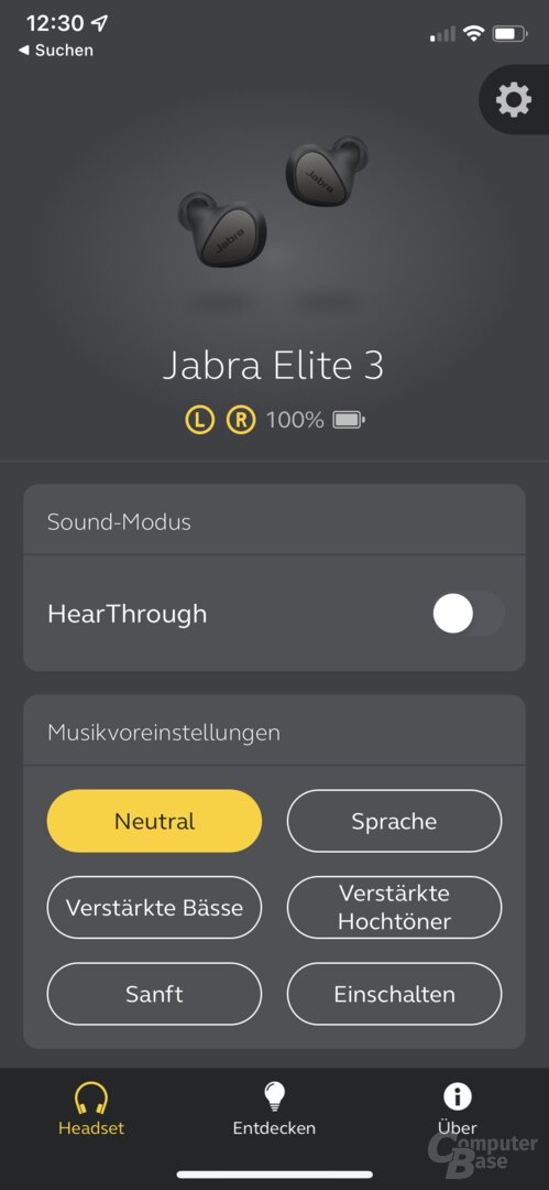 The Elite 3 support Jabra's Sound + headphone app. This not only enables an equalizer with six predefined presets to be used, but also the aforementioned functions for calling up Spotify and Alexa under Android directly via the button on the left earphone can be set in the app. In addition, functions such as Find My Jabra to search for misplaced earbuds are available, the battery level of the earbuds is displayed and the transparency mode can be activated.