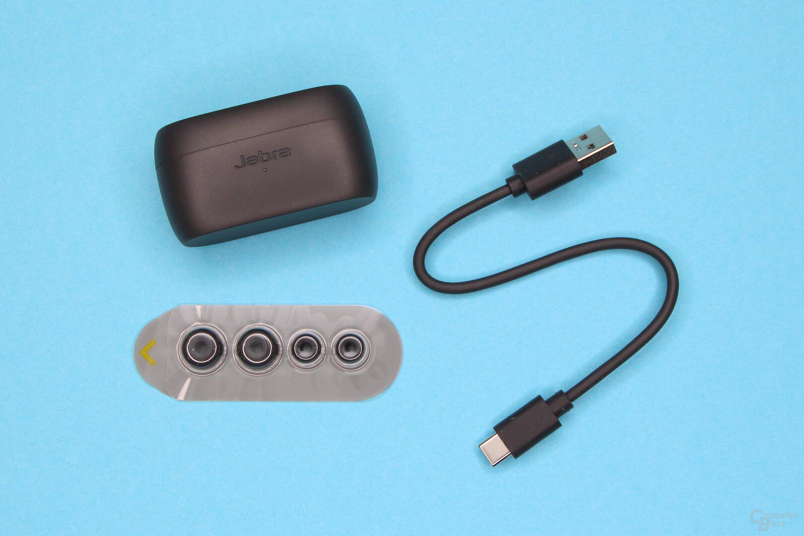 In addition to the earphones and the charging case, the 79 Euro expensive Jabra Elite 3, available from September 1st, comes with a short USB-C to USB-A charging cable and a total of three different sized silicone attachments for the earphones.