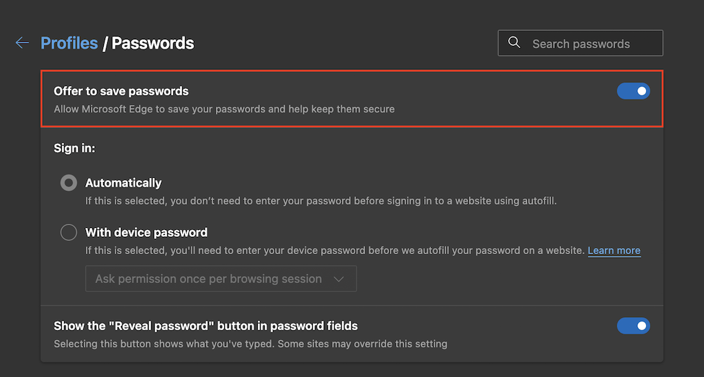 3. Slå på bryteren ved siden av Tilby å lagre passord.