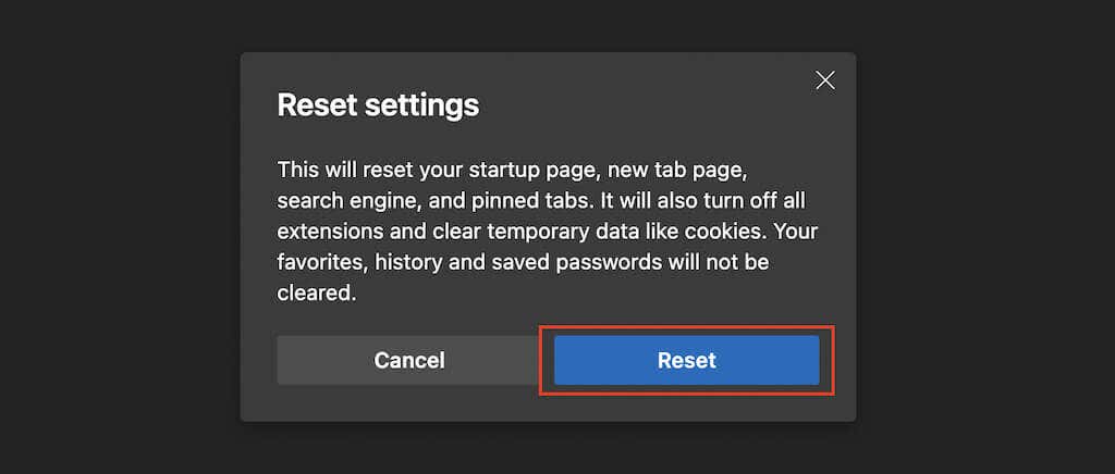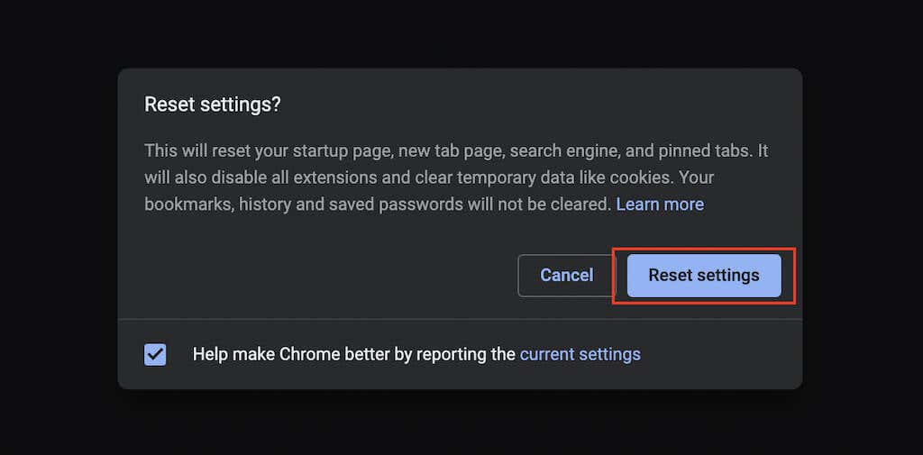 Hvis ingen av rettelsene ovenfor fungerte, prøv å tilbakestille nettleseren til fabrikkinnstillingene. Du vil ikke miste noen lagrede bokmerker eller passord, men det er best å synkronisere dataene dine med Google-, Firefox- eller Microsoft-kontoene dine før du går videre.