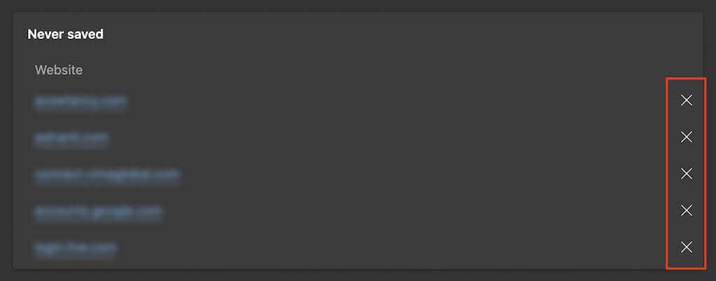 3. Rull ned til du kommer tilAldri lagret-delen. Fjern deretter alle nettsteder du ikke vil beholde i listen ved å velge X-ikonet ved siden av hver oppføring.