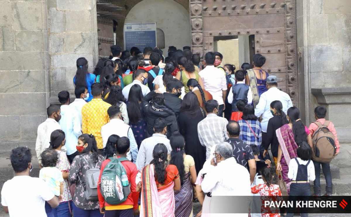 Da die Touristenattraktionen in Maharashtra ab morgen für Bürger geschlossen bleiben, versammelten sich am Sonntag Menschen in Shaniwarwada in Pune. Nach einer Weile kam die Polizei wegen der Menschenmenge dorthin und stellte den Übertretern Challans aus, die keine Masken trugen.