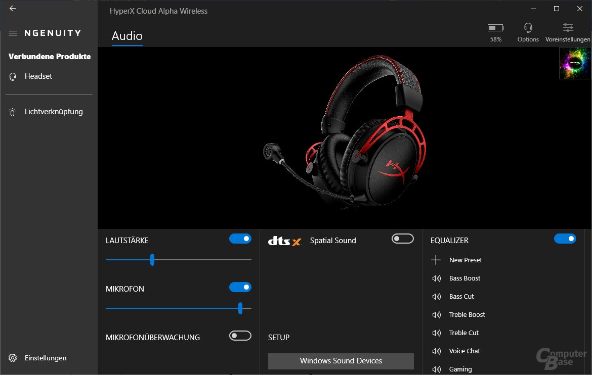 On the other hand, HyperX does without the well-known light effects in its new headset. Additional settings can be made or information obtained via the software already described, including viewing the battery status. The functionality is explained in more detail at the appropriate points.