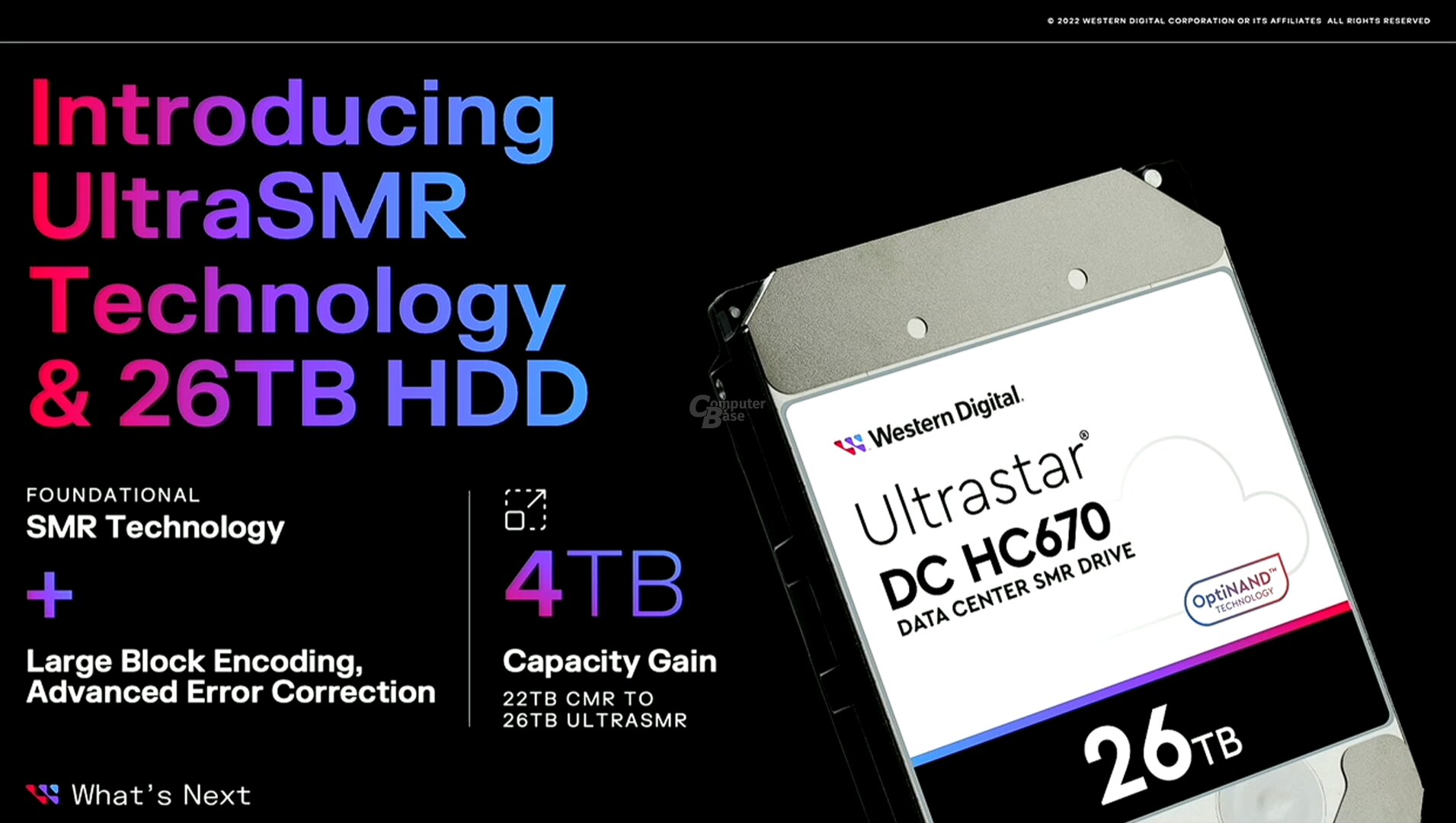 Ultrastar DC HC670 26TB With UltraSMR technology, Western Digital combines OptiNAND with a proprietary firmware, which is based on further developments of the HDD system level. The new technology combines, for the first time, large block coding with an advanced error correction algorithm that increases the number of tracks per inch (TPI) for greater capacity.