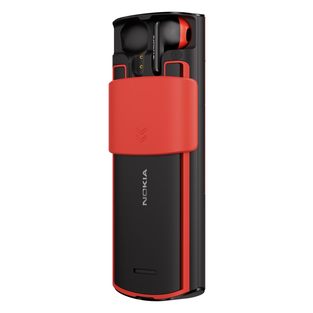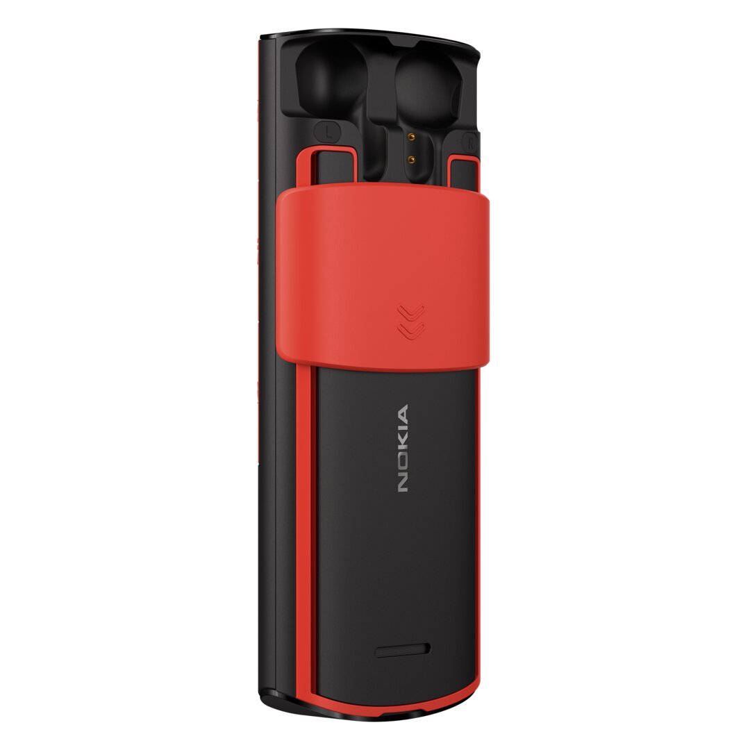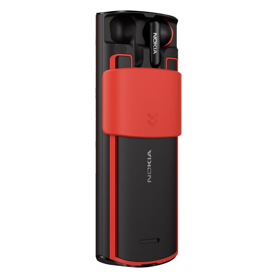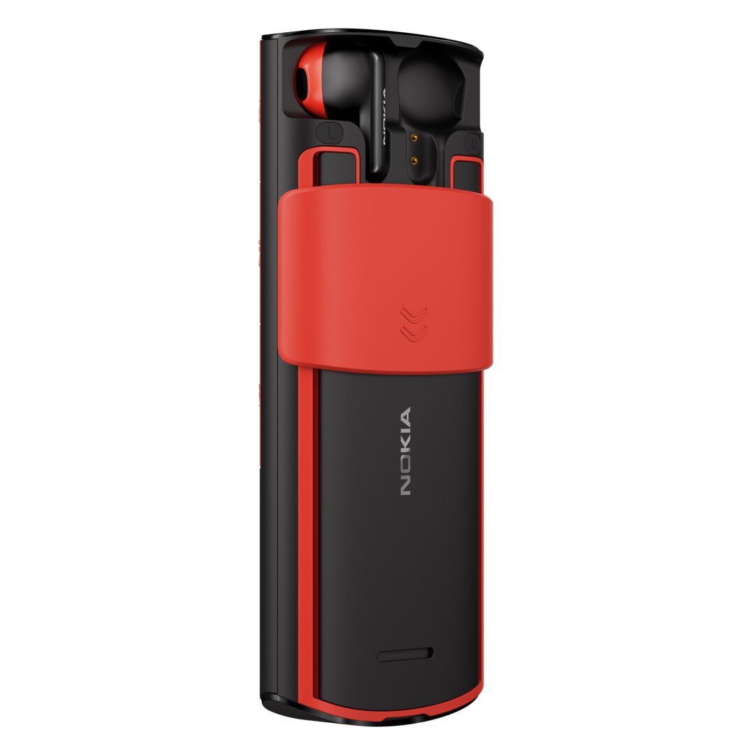 The Nokia 5710 XpressAudio is not a revival of an earlier phone, but it also belongs to the category of feature phones. As a special feature, it hides true wireless headphones on the back and reveals them via a sliding mechanism. The 5710 measures 138.9 × 58.85 × 18.5 mm and also runs on a 2.8-inch QVGA display with a Unisoc T107 processor and Series 30+ OS. Hardware and software are the same as the 8210 4G, except that the 1,450 mAh battery on the 5710 also charges the TWS headphones.