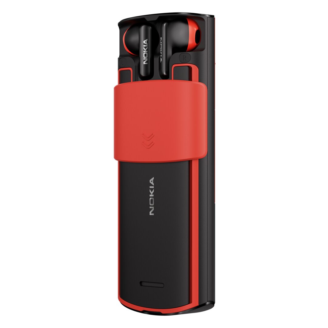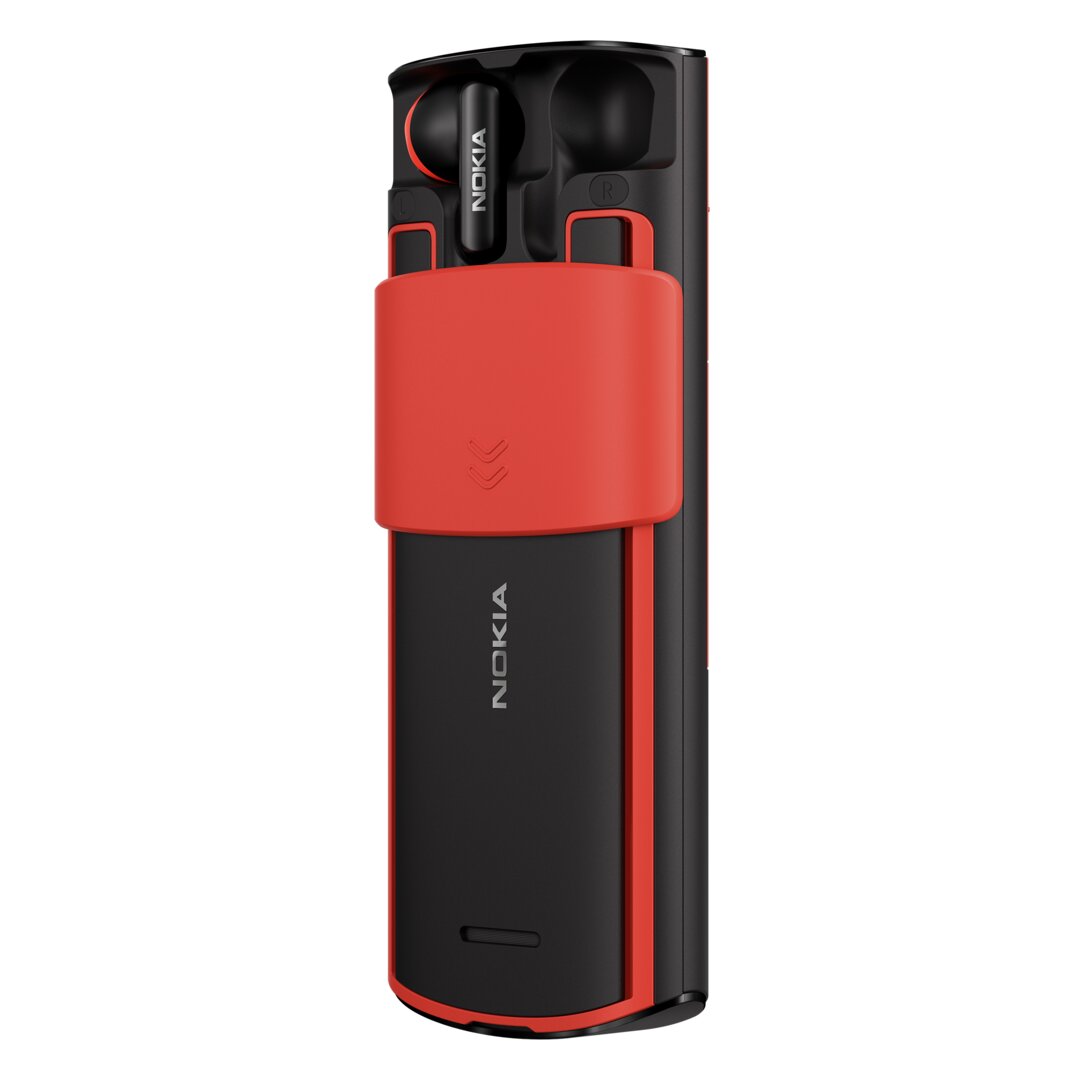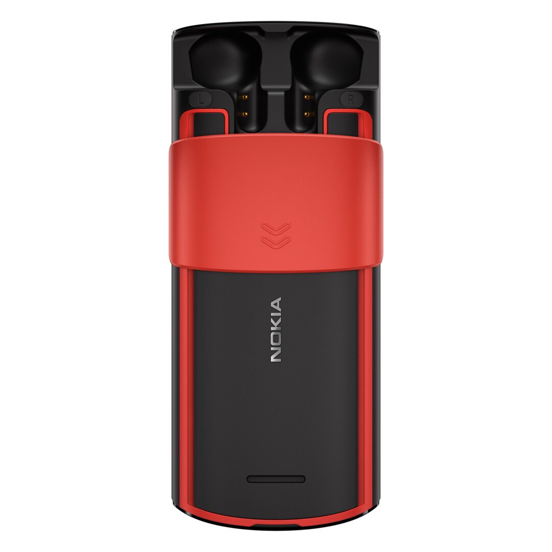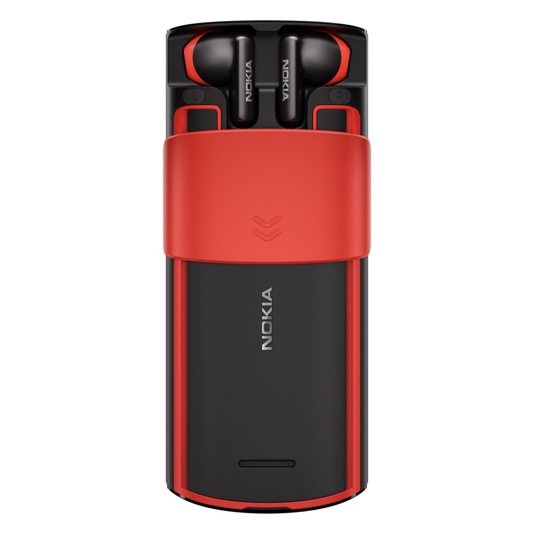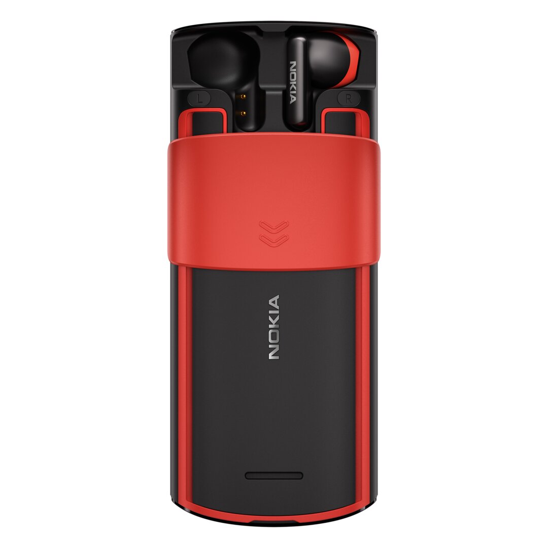 The Nokia 5710 XpressAudio is not a revival of an earlier phone, but it also belongs to the category of feature phones. As a special feature, it hides true wireless headphones on the back and reveals them via a sliding mechanism. The 5710 measures 138.9 × 58.85 × 18.5 mm and also runs on a 2.8-inch QVGA display with a Unisoc T107 processor and Series 30+ OS. Hardware and software are the same as the 8210 4G, except that the 1,450 mAh battery on the 5710 also charges the TWS headphones.