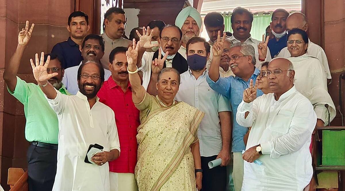 Oppositionskandidaten till vicepresidentvalet Margaret Alva avbildades med kongressledaren Rahul Gandhi och flera andra oppositionsledare under hennes nomineringsanmälan på tisdagen. (Express Photo)