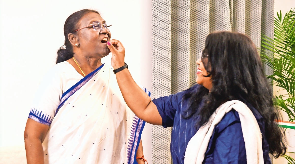 La présidente élue Droupadi Murmu célèbre avec sa fille Itishree à New Delhi jeudi. PTI
