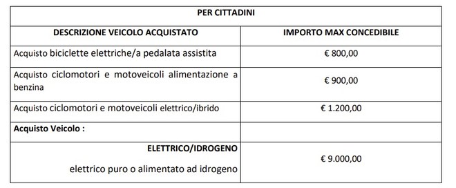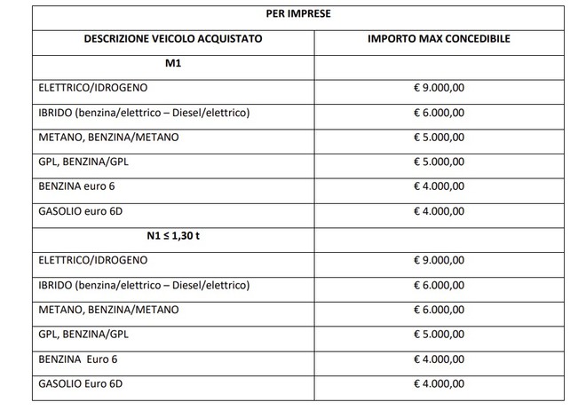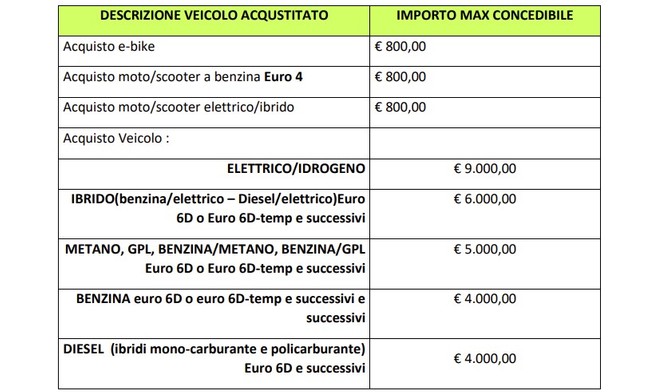 9,000 euros for electric and hydrogen vehicles, electric and hydrogen commercial vehicles up to 1.3 tons; 6,000 euros for hybrids and commercial vehicles up to 1.3 tonnes of hybrids, methane and petrol-methane; €5,000 for methane, petrol-methane and LPG, petrol-LPG, commercial vehicles up to 1.3 tonnes, electric, hydrogen and petrol-LPG; 4,000 euro for petrol and diesel euro 6D-temp or later, commercial vehicles up to 1.3 tonnes petrol and diesel euro 6D-temp or later; 800 euros for hybrid and electric mopeds and motorcycles and for pedal-assisted or electric-drive cargo bikes.