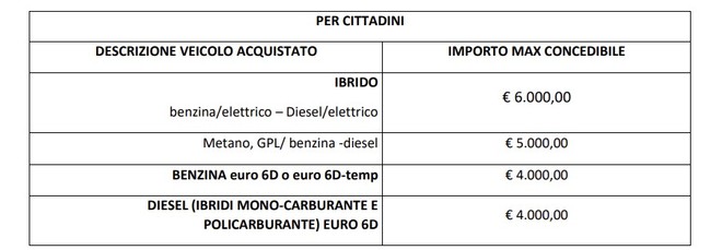 For individuals, the maximum amount that can be granted is: 800 euros for the purchase of hybrid and electric, hybrid and electric e-bikes, motorcycles and scooters; €9,000 for electric and hydrogen vehicles, €6,000 for a 6D-temp hybrid or later; 5,000 euros for methane, LPG, petrol-methane, petrol-LPG euro 6D-temp or later; 4,000 euros for Euro 6D-temp gasoline or later and Euro 6D-temp diesel or later.