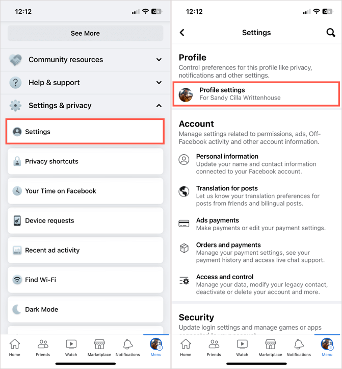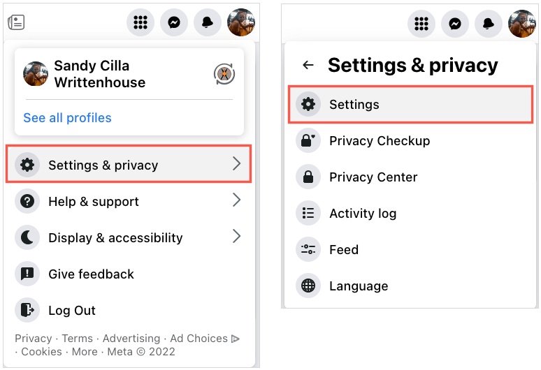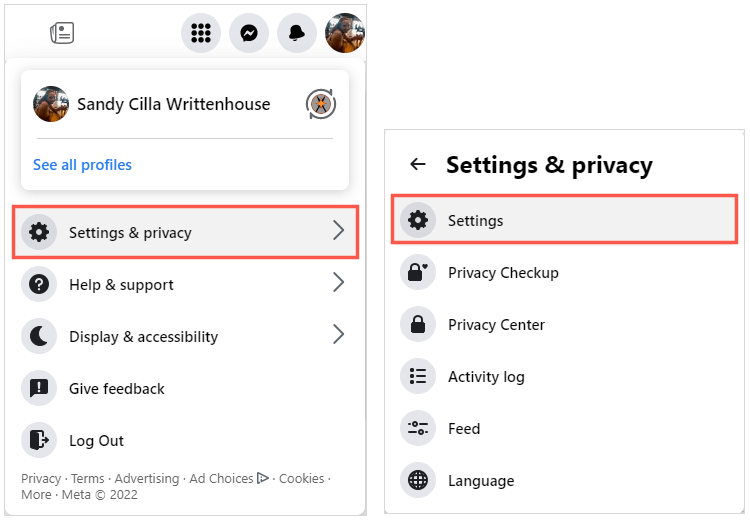 2. Välj Inställningar & sekretess och välj sedan Inställningar.
