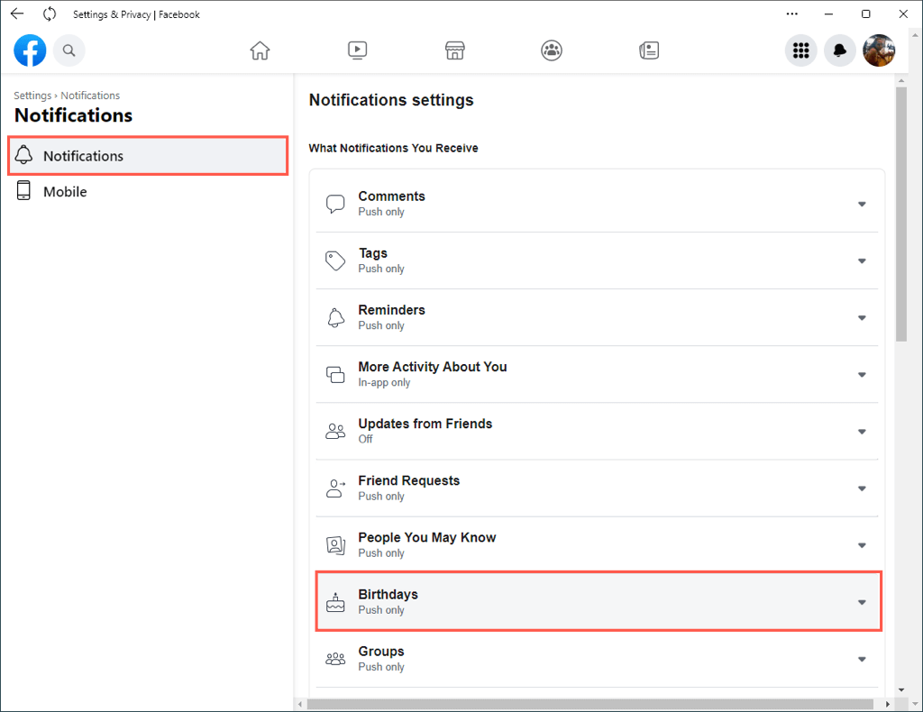 Om du använder skrivbordsprogrammet Facebook på Windows kan du redigera födelsedagsaviseringarna där på samma sätt som på webben. När detta skrivs finns det ingen officiell Facebook-skrivbordsapp för macOS.