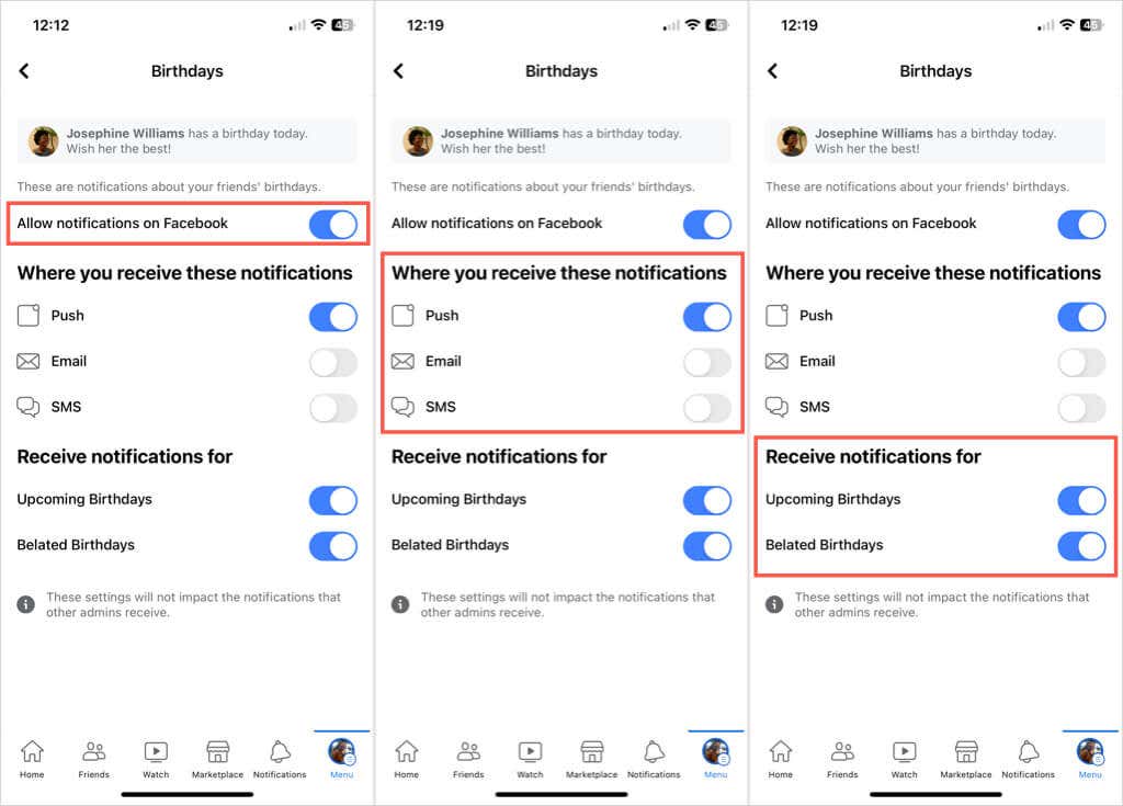 3. Aktivera sedan växlarna för kommande födelsedagar, försenade födelsedagar eller båda.