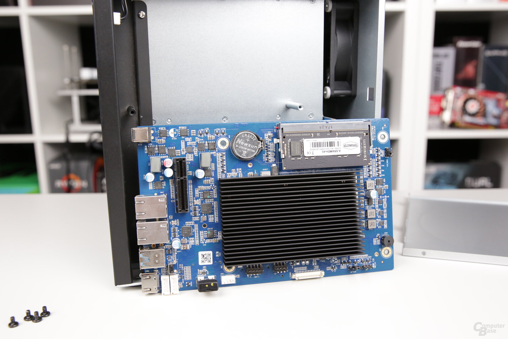 To install a second module, the side of the NAS must be opened using the two screws on the back. The RAM slot is then freely accessible on the back of the board, where the M.2 slots are also located. The factory-installed module, on the other hand, is placed on the inside of the circuit board. In order to exchange it, the circuit board must first be removed.