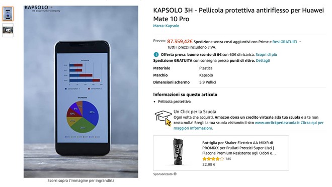 La descrizione è chiara "KAPSOLO 3H – Pellicola protettiva antiriflesso per Huawei Mate 10 Pro". Nome a parte, che da solo vale un sorriso, le foto che mostrano l'oggetto sono ovviamente sbagliate: