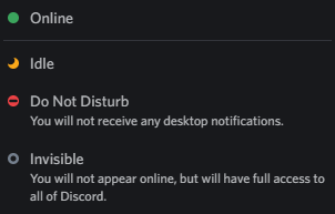 Som du allerede har lagt merke til, har Discord en rekke statuser tilgjengelig for deg. Her er en rask guide til hva hver av dem betyr: