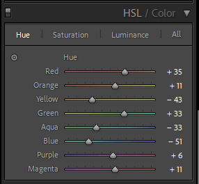 For å bruke fargekorrigering, vil du gå til HSL/Color-modulen. Her ser du listen over farger med tre kolonner: Farge, Metning og Luminans. Nyanse påvirker den faktiske fargen. Du kan for eksempel endre gult til å bli mye mer oransje. Metning påvirker intensiteten til fargen. Til slutt endrer Luminans lysstyrken til fargen.