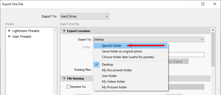 - < li>For å velge eksportsted, åpne rullegardinmenyen ved siden av “Eksporter til” og velg Spesifikk mappe. Naviger til mappen du vil eksportere til, velg den og velg OK.