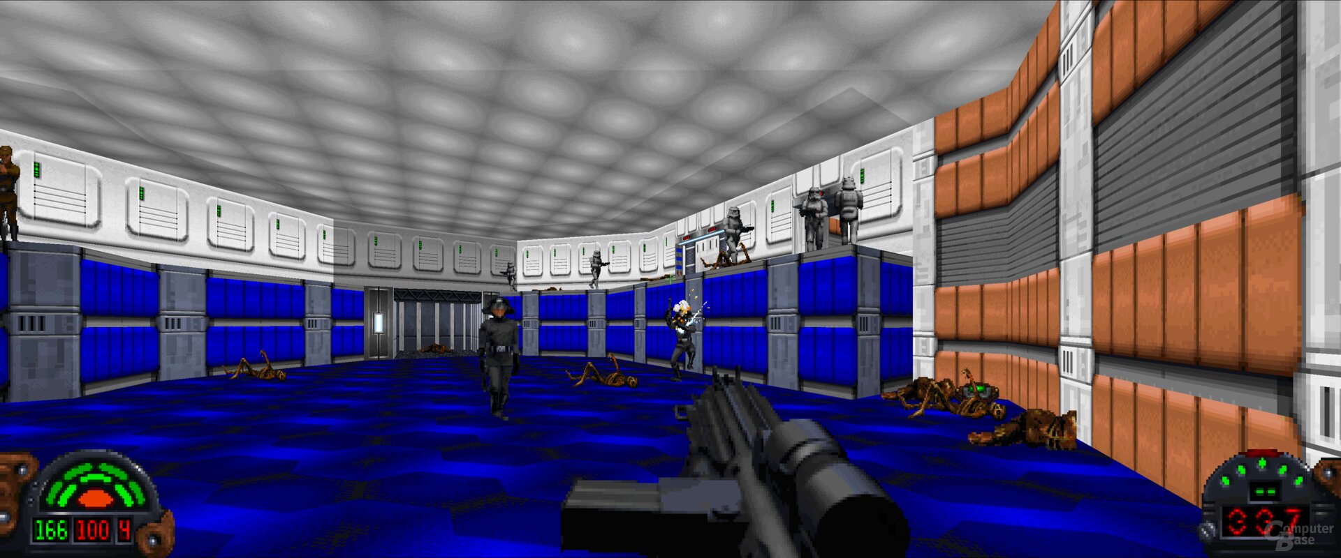 With a new engine, Dark Forces runs faster and looks sharper. Only textures remain pixelated, especially weapons, and the opponents, which are only displayed as sprites, are of poor quality. Thanks to mouse control and endurance racing, Dark Forces becomes a fast-paced shooter that doesn't even have to be aimed very precisely, because the aiming aid of the original is retained. The same applies to the midi tones – Dark Forces sounds wonderfully nostalgic and still looks old despite the higher resolution. A trailer shows what it looks like in motion.
