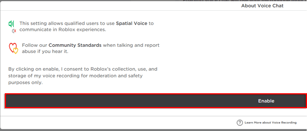 < li>Du vil bli bedt om å samtykke til Roblox sin samling av stemmeopptakene dine. Hvis du er enig, trykk på Aktiver.