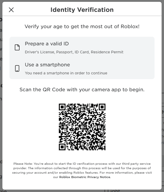 For å bruke Roblox sin stemmechat i spillet, må du ha en Roblox-konto som er 13+ og aldersbekreftet. For å gjøre det trenger du en gyldig ID (som pass eller førerkort) og en smarttelefon som kan skanne QR-koder. Roblox vil be deg om å sende inn et bilde av ID-kortet ditt og en selfie for å bevise en likhet.