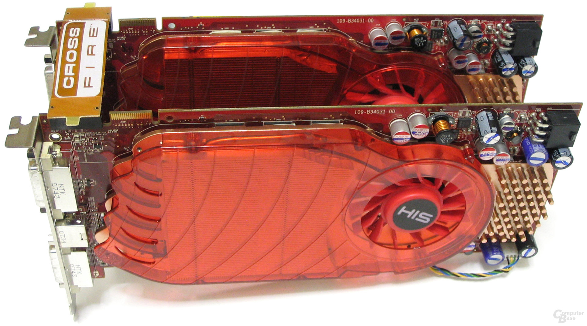 ATi Radeon HD 3870 CrossFireAlso to be noted were the different memory configurations, which came into play in particular in higher resolutions and quality settings – the focus of the test. The GeForce 8800 Ultra was at the top with 768 MB GDDR3, the GeForce 8800 GT and the Radeon HD 3870 had 512 MB GDDR3, and the Radeon HD 3850 brought up the rear with 256 MB GDDR3. In SLI and CrossFire systems there was twice the graphics memory physically, but the effective amount of usable memory was the same due to the Alternate Frame Rendering used, in which the graphics cards calculated images alternately and therefore had to reserve the entire memory.