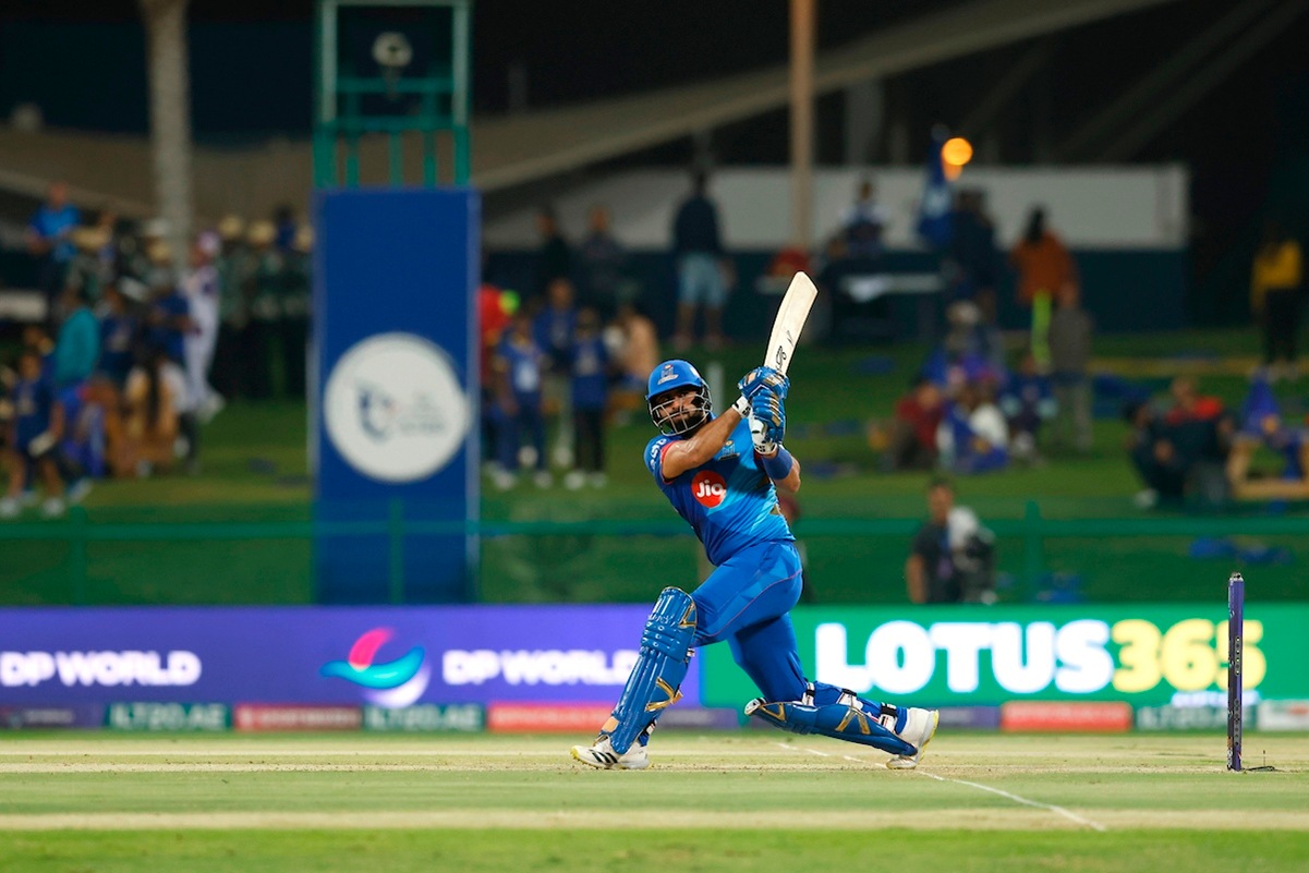 Muhammad Waseem van MI Emirates bats tijdens wedstrijd 26 van de DP World International League T20 tussen MI Emirates en Abu Dhabi Knight Riders gehouden in het Zayed Cricket Stadium, Abu Dhabi, 3 februari 2023. (Deepak Malik/CREIMAS)