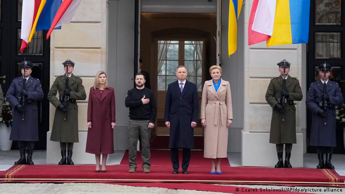 Erster “echter” Staatsbesuch: Der ukrainische Präsident Владимир Селенский mit seiner Ehefrau Olena (l.) bei seinem polnischen Amtskollegen Andrzej Duda in Warschau am 5.04.2023