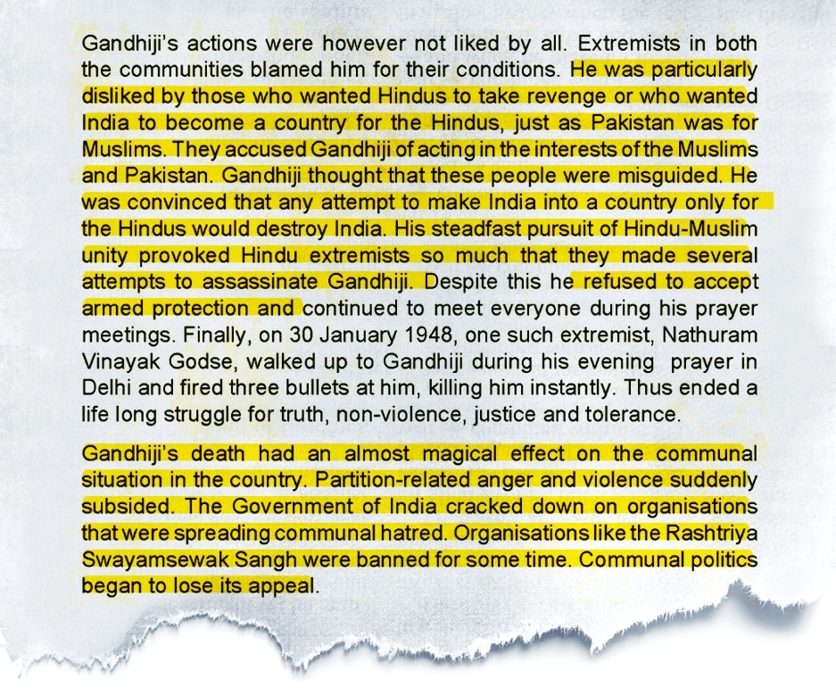 Recenti cambiamenti nei libri di testo NCERT, che sono stati criticati da accademici e partiti di opposizione, includono la rimozione di una menzione dell'impopolarità del Mahatma Gandhi tra gli estremisti indù e del divieto imposto al Rashtriya Swayamsevak Sangh (RSS) all'indomani del suo assassinio.