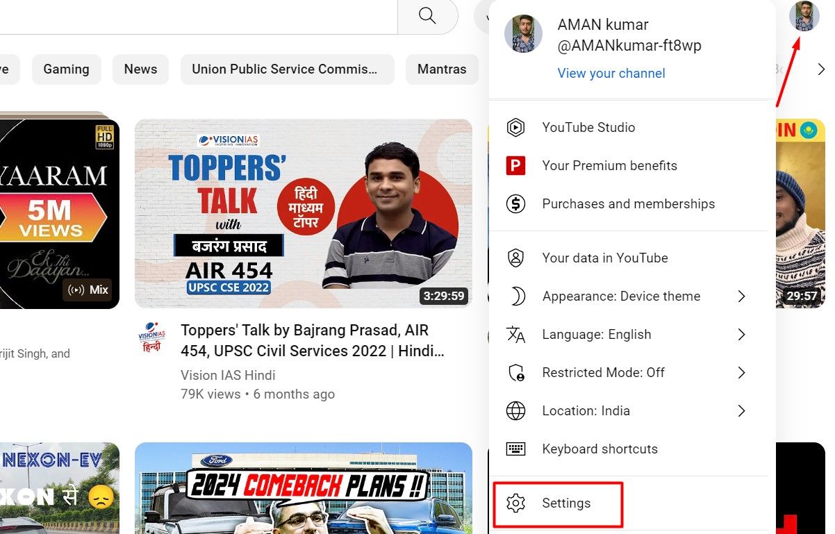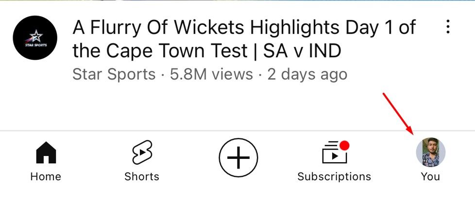 Öppna först YouTube-appen och tryck på din profilikon i det nedre högra hörnet.