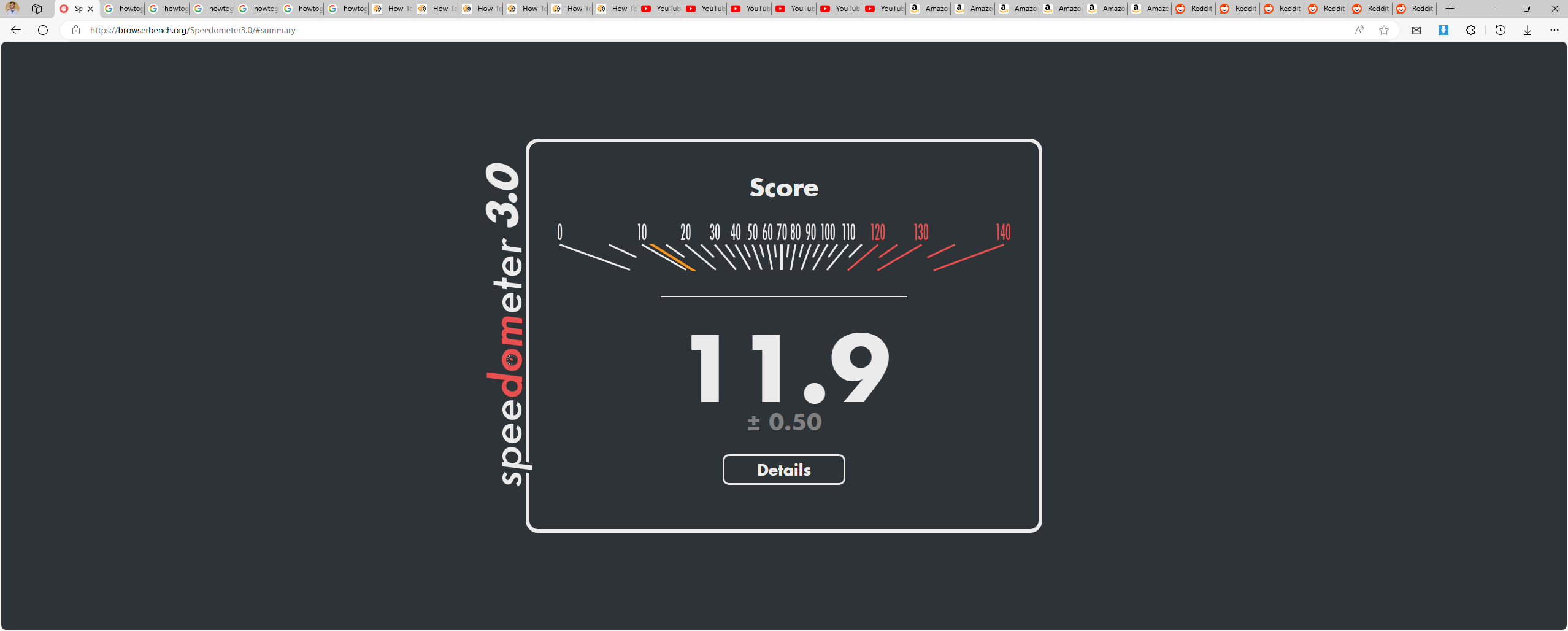 Um die Effektivität der Speicherverwaltung von Chrome, Firefox und Edge zu testen, verwende ich den Browser-Benchmark Speedometer 3.0. Bei einem solchen Test spielen jede Menge Variablen eine Rolle – hauptsächlich die Spezifikationen meines Computers und welche Websites ich öffne. Um die Dinge so konsistent wie möglich zu halten, lade ich fünf verschiedene Websites, führe den Speedometer-Test aus, öffne dieselben fünf Tabs erneut, führe den Test aus und wiederhole das Ganze, bis ich 30 Tabs geöffnet habe.
