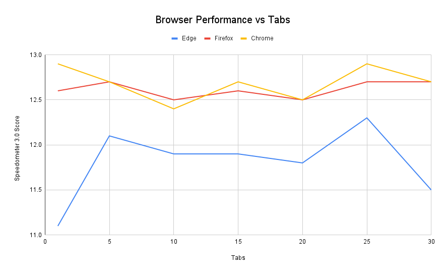 Microsoft Edge wies die größte Varianz zwischen den Wertungen auf, aber Sie werden feststellen, dass sie nicht schlechter wurden, je mehr Tabs geöffnet wurden. Seltsamerweise lagen die beiden schlechtesten Werte an entgegengesetzten Enden des Spektrums – 1 Tab und 30 Tabs. Das sagt mir, dass die Tabs nur sehr geringe Auswirkungen auf die Leistung hatten.
